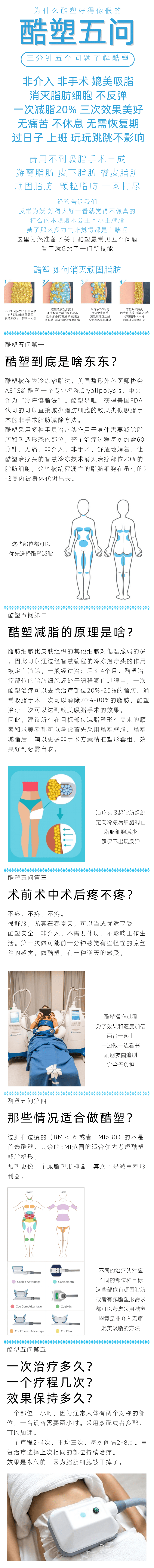 酷塑是采用半导体制冷技术的治疗头,在腰腹臀部将脂肪组织夹住,让后编程致冷,引起脂肪细胞凋亡。就是 「冻死」 脂肪细胞,却不影响身体其他组织细胞。这个技术不用开刀手术、无需服药,效果固定时间与吸脂手术差不多,平均三个月,即可达到良好效果。